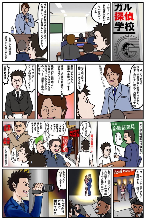 探偵学校への入校から卒業後に探偵社へ就職し、探偵として活躍姿を漫画でご紹介します。